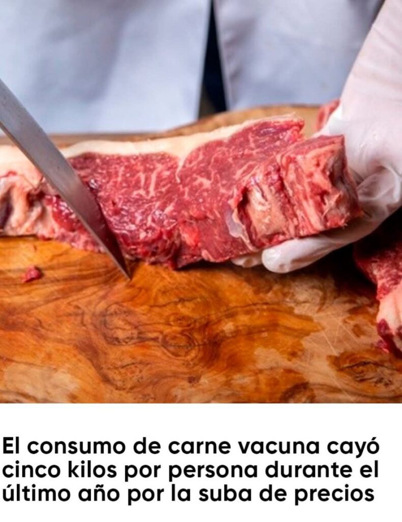 l consumo de carne vacuna en Argentina registró una fuerte caída en el último año, pasando de 49,5 a 44,5 kilos por persona, según datos de la Fundación Agropecuaria para el Desarrollo de Argentina.