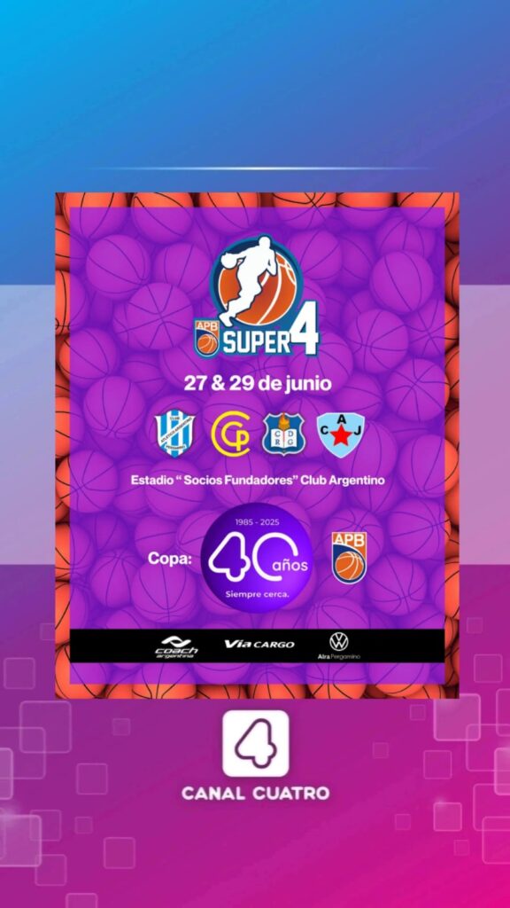 El próximo viernes 27 y domingo 29 de junio, el estadio Socios Fundadores será escenario de una de las citas más esperadas del calendario deportivo local: el Súper 4 de la Asociación Pergaminense de Básquet (APB), que este año celebra los 40 años de Canal 4 Pergamino con una edición especial de la “Copa Canal 4”.