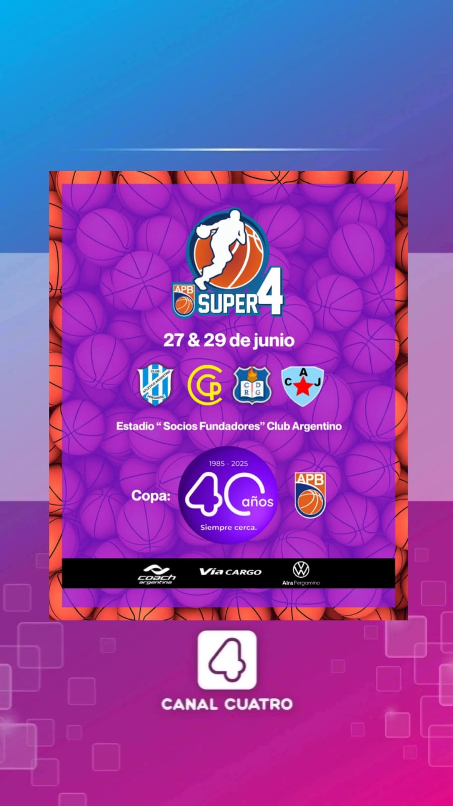 El próximo viernes 27 y domingo 29 de junio, el estadio Socios Fundadores será escenario de una de las citas más esperadas del calendario deportivo local: el Súper 4 de la Asociación Pergaminense de Básquet (APB), que este año celebra los 40 años de Canal 4 Pergamino con una edición especial de la “Copa Canal 4”.