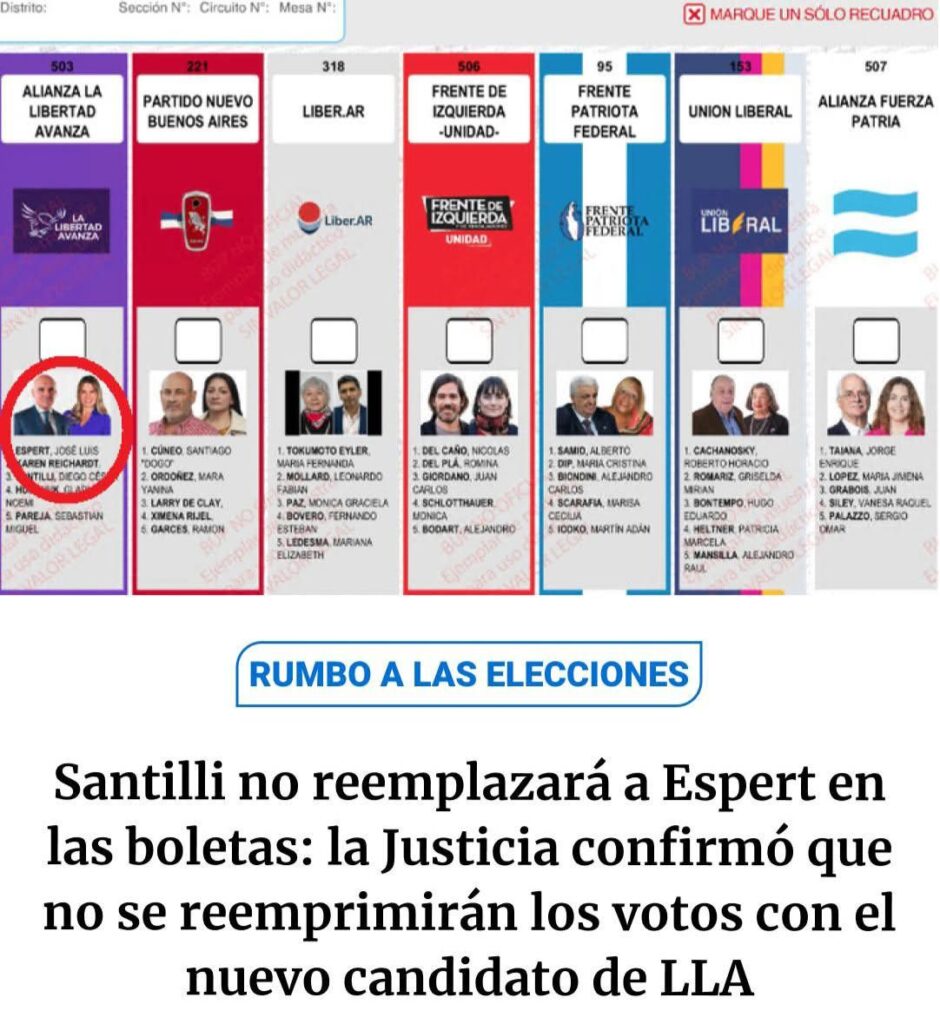 La Justicia Electoral rechazó el pedido de La Libertad Avanza para modificar las boletas en la provincia de Buenos Aires, que aún incluyen la imagen de José Luis Espert. El fiscal federal con competencia electoral, Ramiro González, sostuvo que ya no hay tiempo material para realizar una reimpresión completa antes de los comicios.