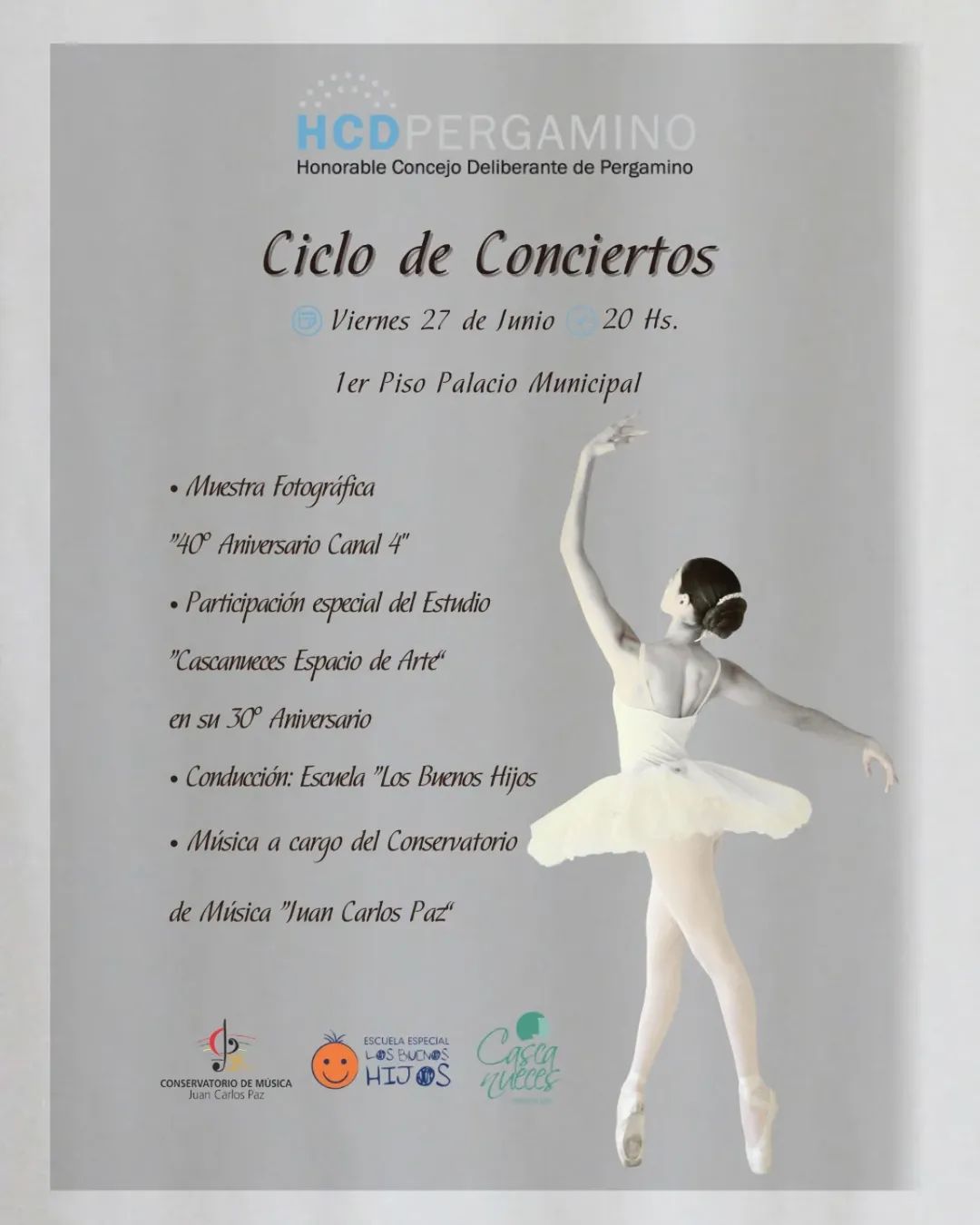 Este viernes 27 de junio, a partir de las 20 horas, el Concejo Deliberante abrirá sus puertas para una nueva edición del Ciclo de Conciertos, un evento que propone un espacio de integración a través de la música, la danza y la fotografía.