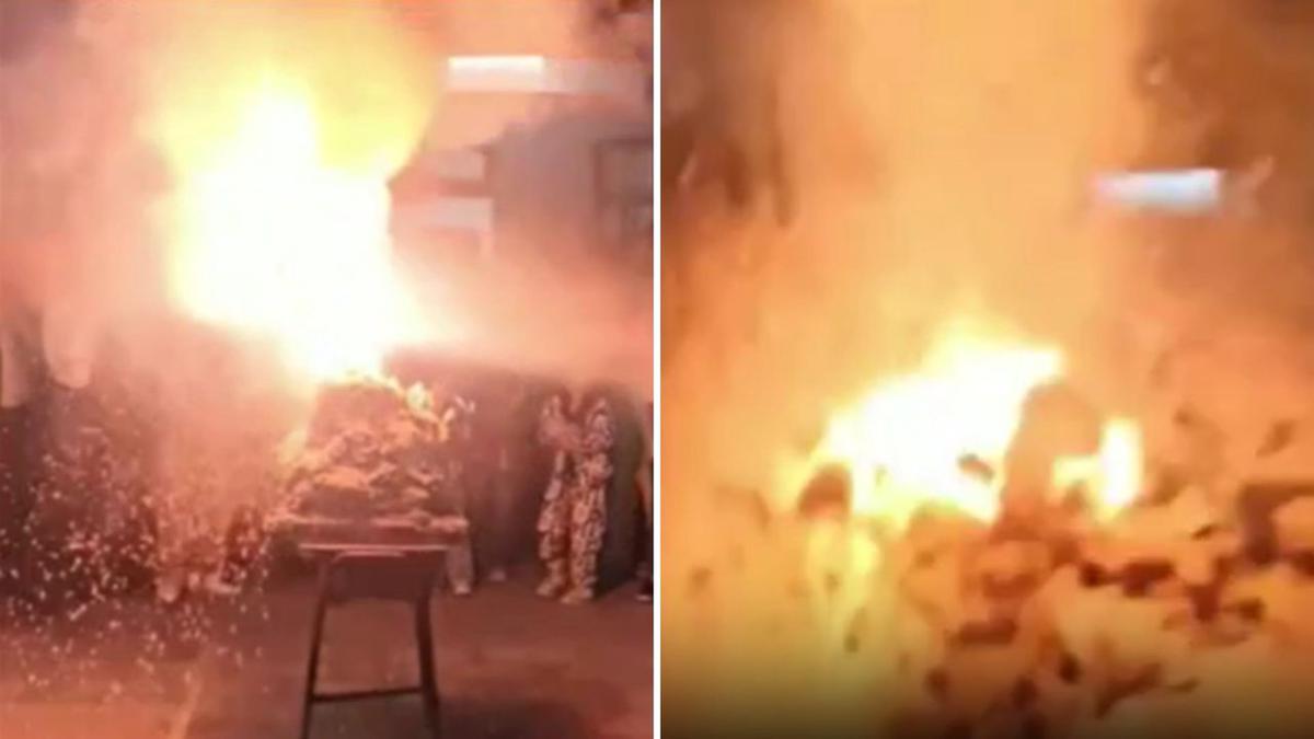 El hecho que conmocionó a la localidad fue grabado por uno de los asistentes y en el video se observa el momento en el que docentes encendieron el artefacto y segundos después explotó, lo que generó corridas y gritos.