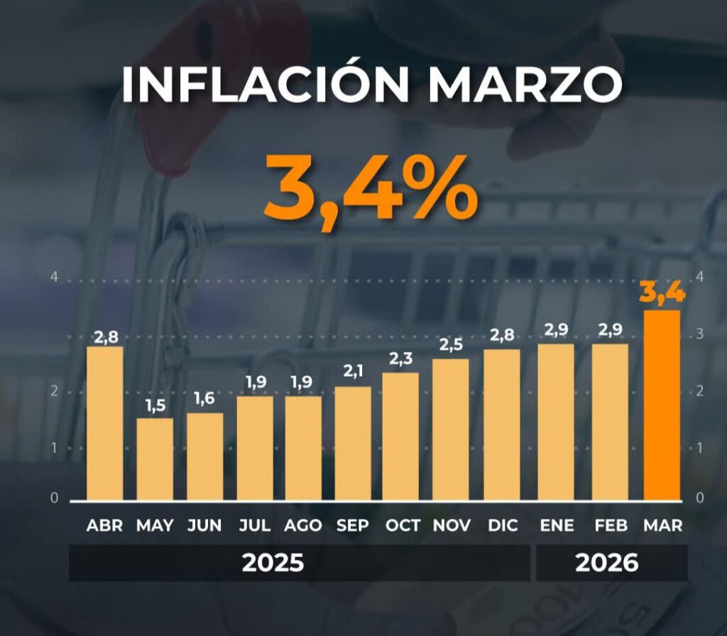 El INDEC informó que la inflación de marzo fue del 3,4%, el registro mensual más alto en lo que va de 2026 y una aceleración respecto al 2,9% que se había repetido en enero y febrero.