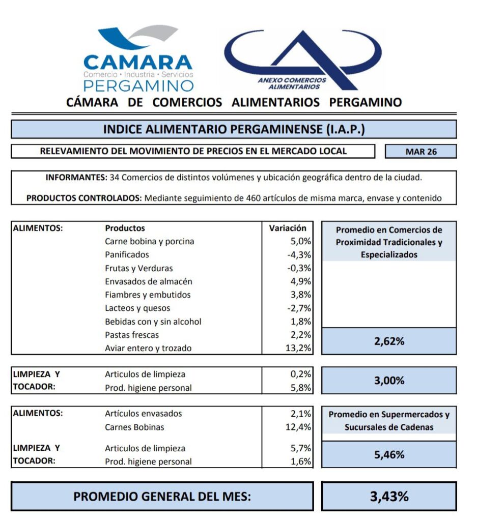 Un relevamiento realizado por la Cámara de Alimentarios de Pergamino confirmó que los precios de los alimentos registraron un incremento del 3,43% durante el último mes en comercios de la ciudad.