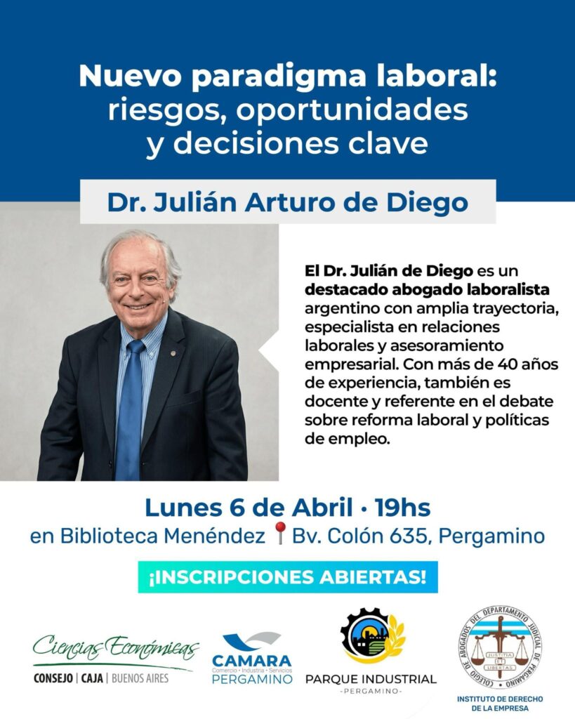 El próximo 6 de abril se realizará en Pergamino la charla “Nuevo paradigma laboral: riesgos, oportunidades y decisiones clave”, una propuesta abierta a la comunidad que tendrá como disertante al reconocido abogado laboralista Dr. Julián Arturo de Diego.