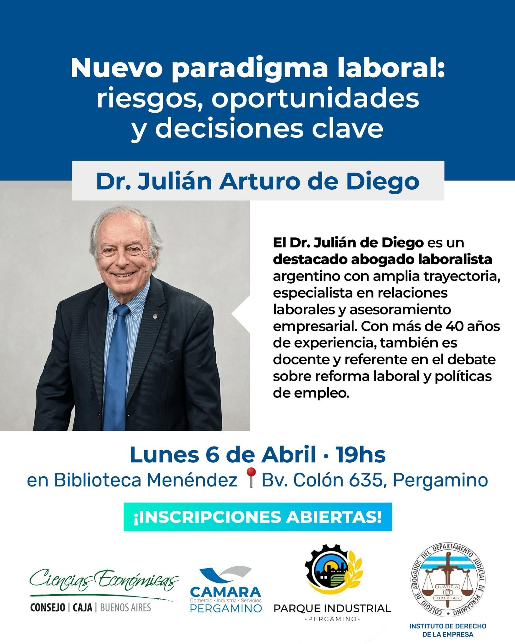 La llegada de Julián Arturo de Diego a Pergamino suma una actividad de interés para empresarios, profesionales, estudiantes, dirigentes y cualquier persona interesada en comprender cómo se reconfigura hoy el vínculo entre trabajo, empresa y legislación.