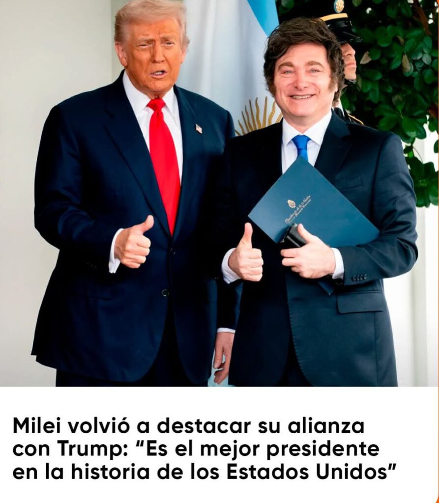 El presidente argentino Javier Milei volvió a destacar su afinidad con Donald Trump, calificándolo como «el mejor presidente en la historia de Estados Unidos«. Según Milei, Trump debería recibir múltiples veces el Premio Nobel de la Paz, ya que, en su opinión, logró cerrar ocho conflictos bélicos, salvando vidas y contribuyendo al bienestar global.